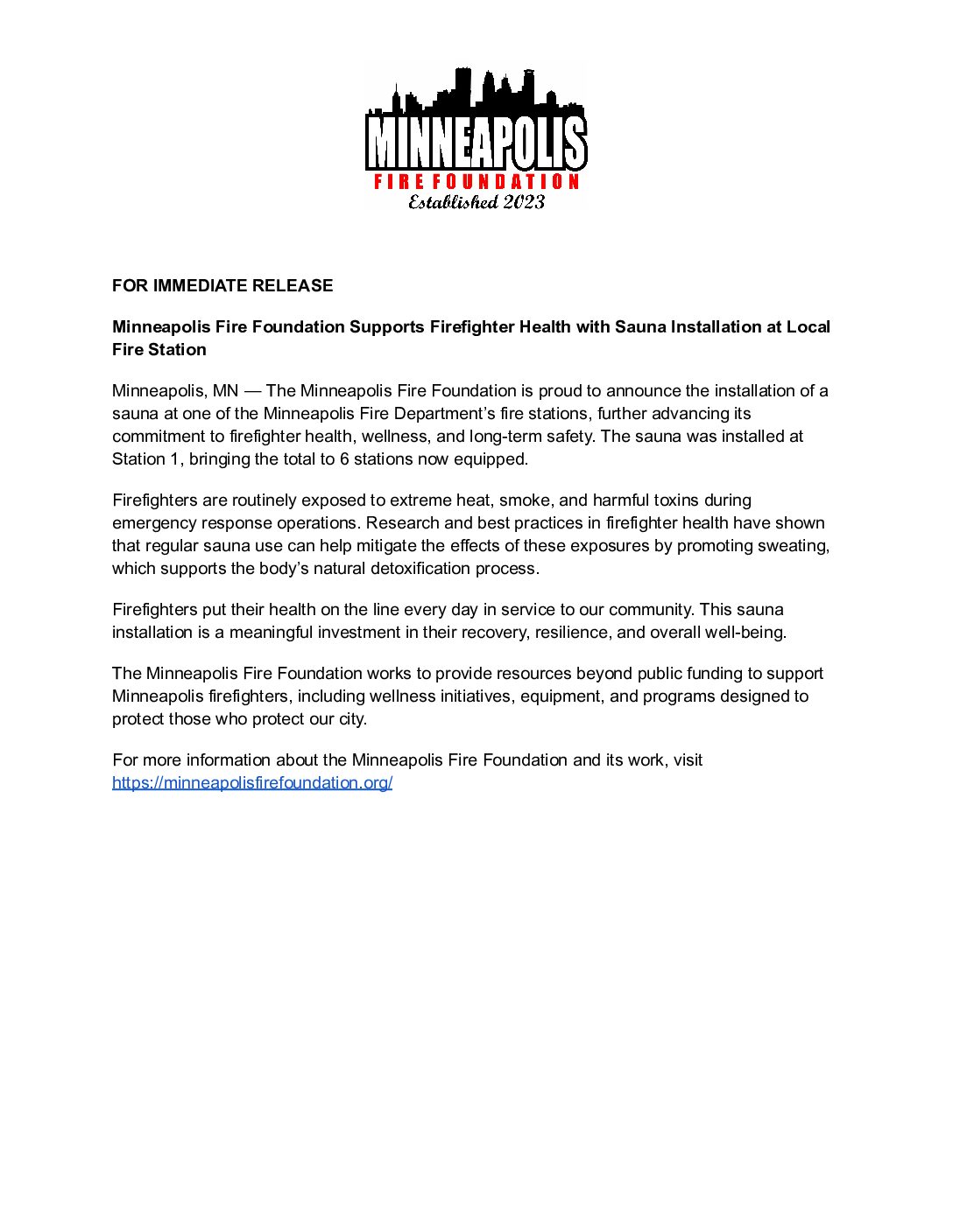 The Minneapolis Fire Foundation, founded in 2023, is committed to being a resource to supplement the needs of the Minneapolis Fire Department. We are dedicated to promoting the well-being and safety of our firefighters and the citizens we serve through the support of services, educational programs, and community initiatives.